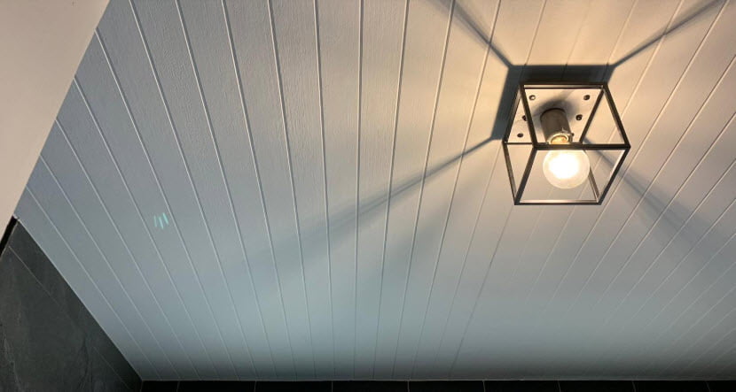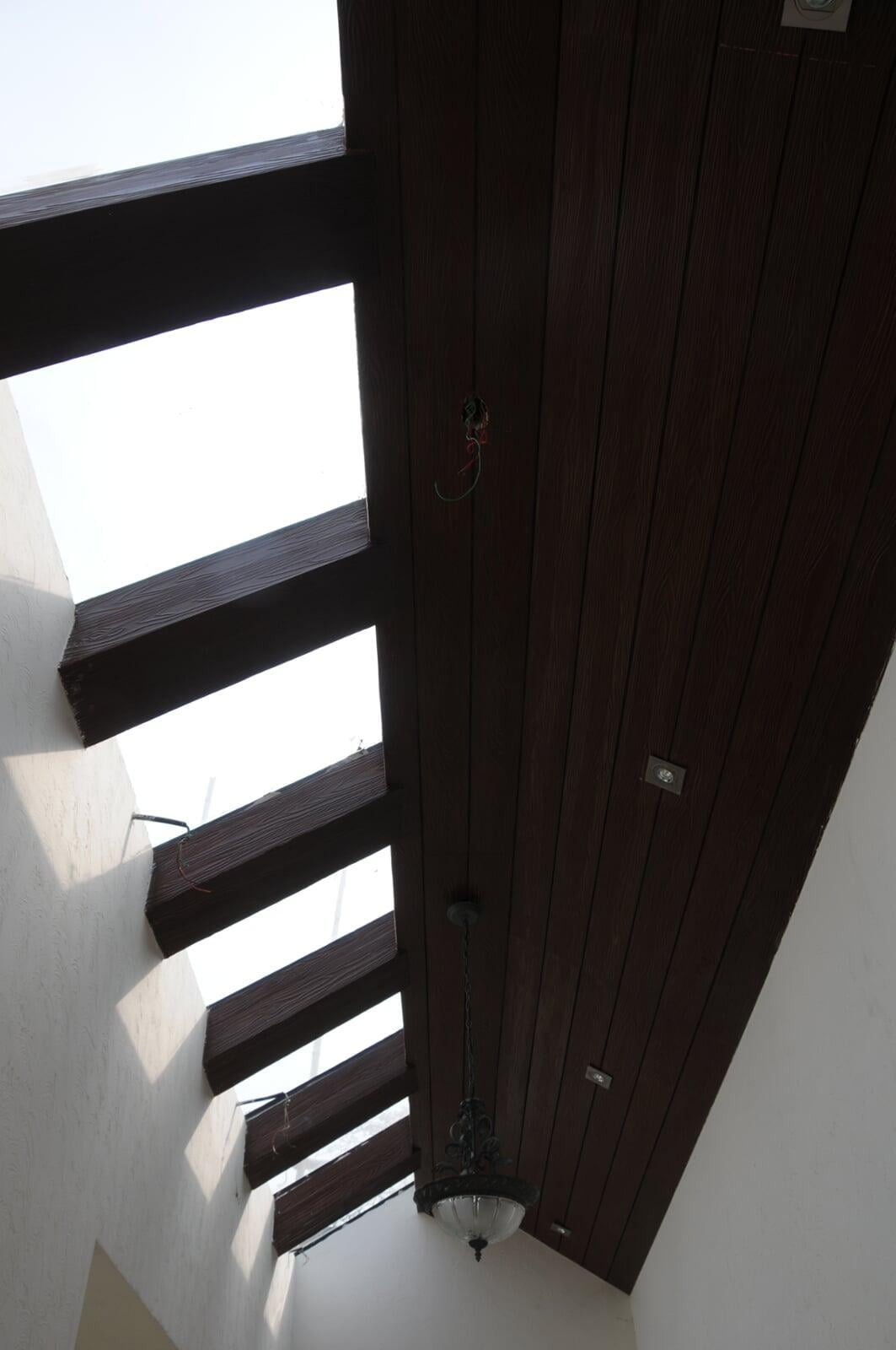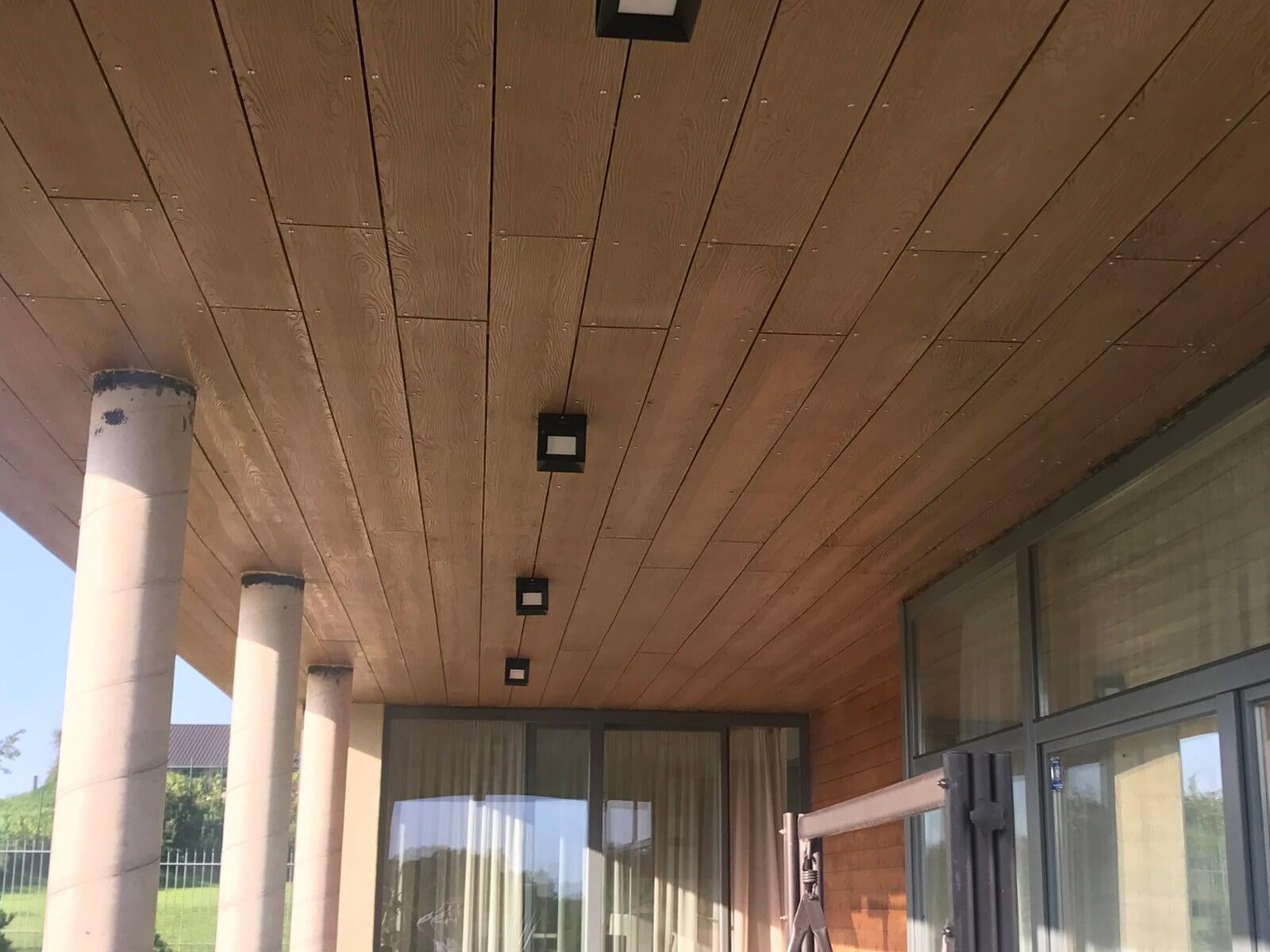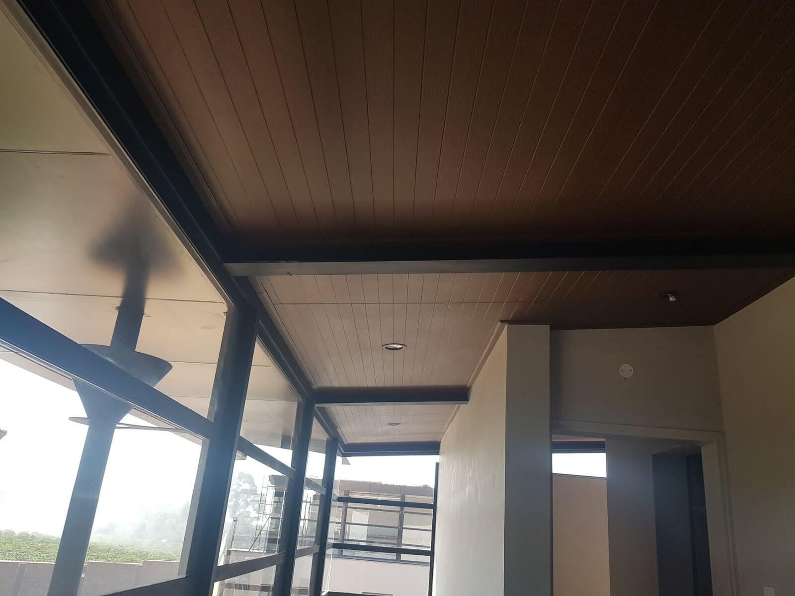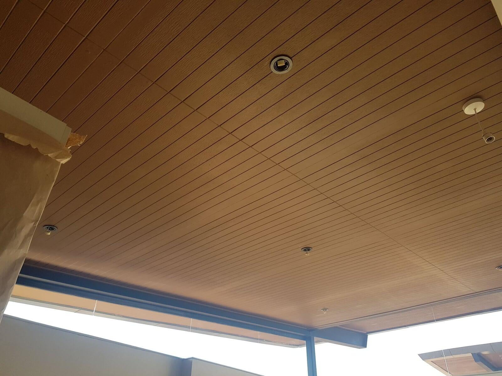 SHERA Planks can be used in ceiling applications too, giving your ceiling finish the appearance of a real wood finish. The image to the left shows SHERA square cut plank, with a teak finish, painted to the project specifications, used in a ceiling application.